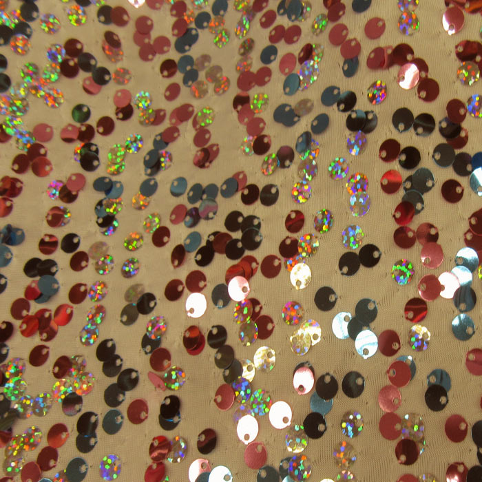 MULTI COLOR DANGILING SEQUINE SEWN ON NUDE COLOR MESH.