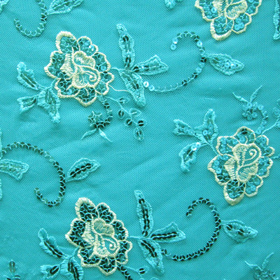 EMBROIDERY FLOWER SEWN ON TURQUISE COLOR TULL MESH