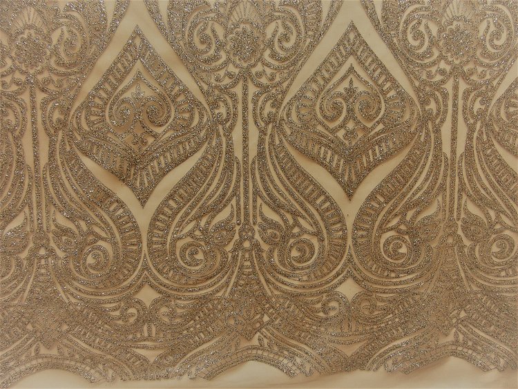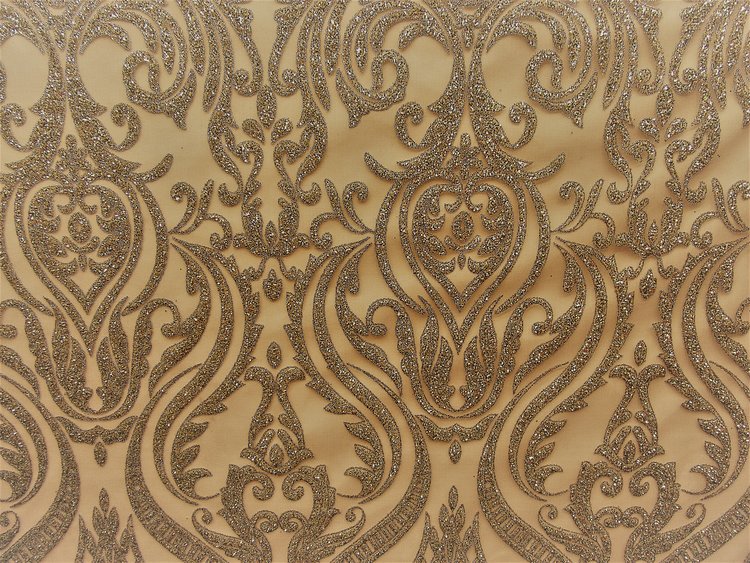 GOLD/GOLDCOLOR GLU GLITTER SEWN ON 100 % POLYESTER GOLD COLOR MESH .