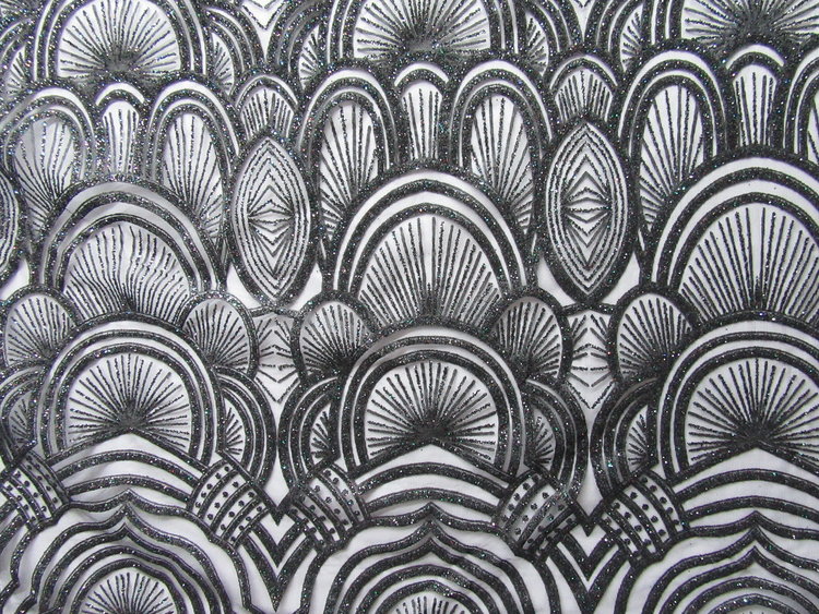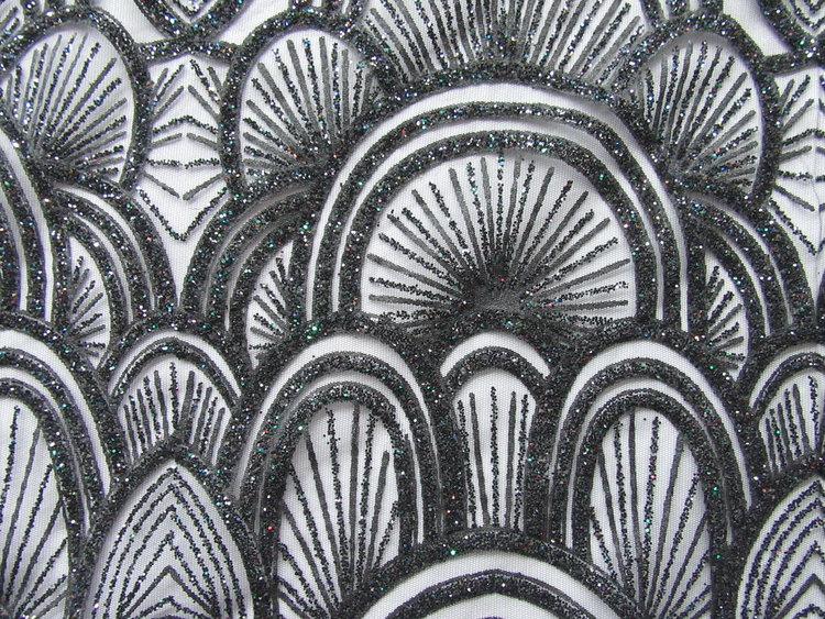 GOLD COLOR GLU GLITTER SEWN ON 100 % POLYESTER BLACK COLOR MESH .