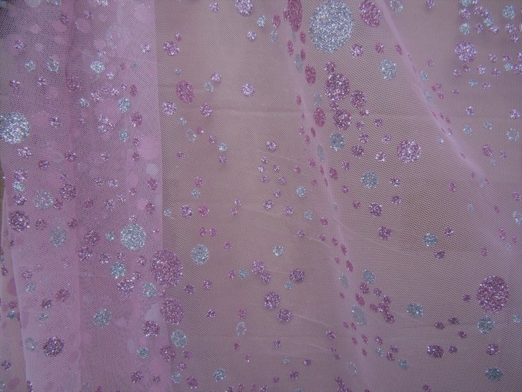 PINK/SILVER COLOR GLU GLITTER SEWN ON 100 % POLYESTER PINK COLOR MESH .