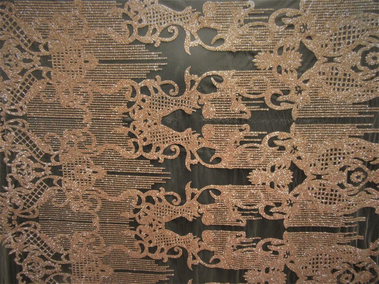 FANCY DESIGN GLU GLITTER SEWN ON 100 % POLYESTER TULL MESH.
