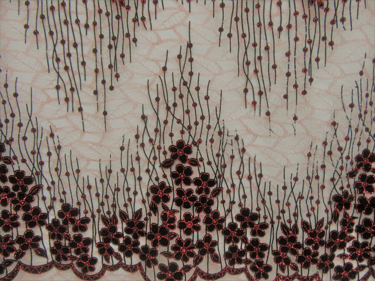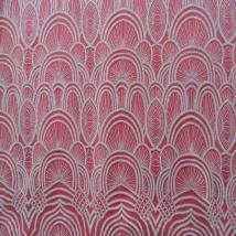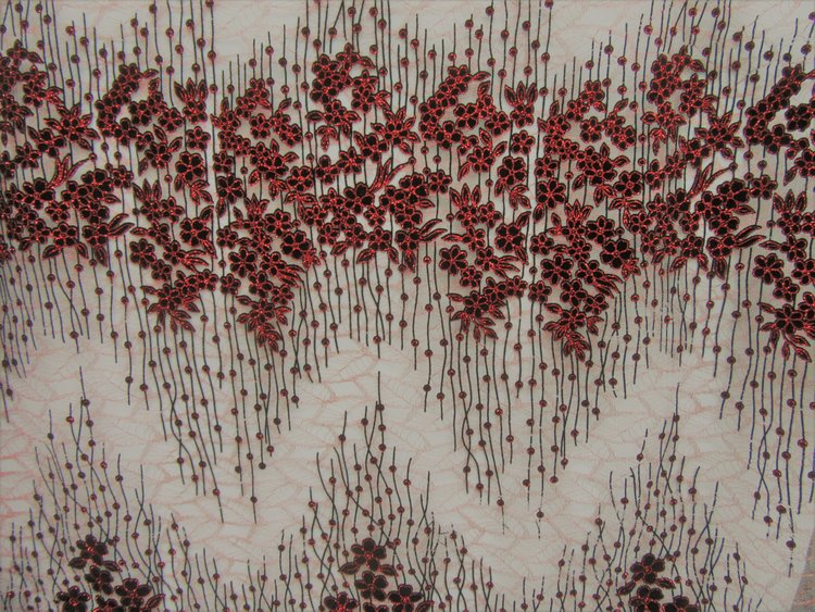 ALL OVER LEAF FLOWER DESIGN SEWN ON 100 % P0LYESTER RED COLOR METALIC TULL NET.