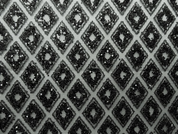 BLACK/BLACK COLOR GLU GLITTER SEWN ON 100 % POLYESTER BLACK COLOR MESH .