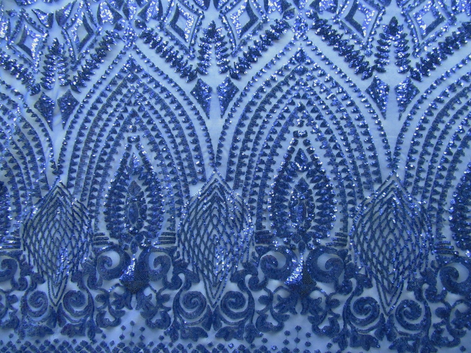 TWO WAY STRETCH SHINY SEQUINE SEWN ON 100 % POLYESTER ROYAL MESH .USAGE : COSTUME , DANCE , DRESS FOR SPECIAL OCCASION .