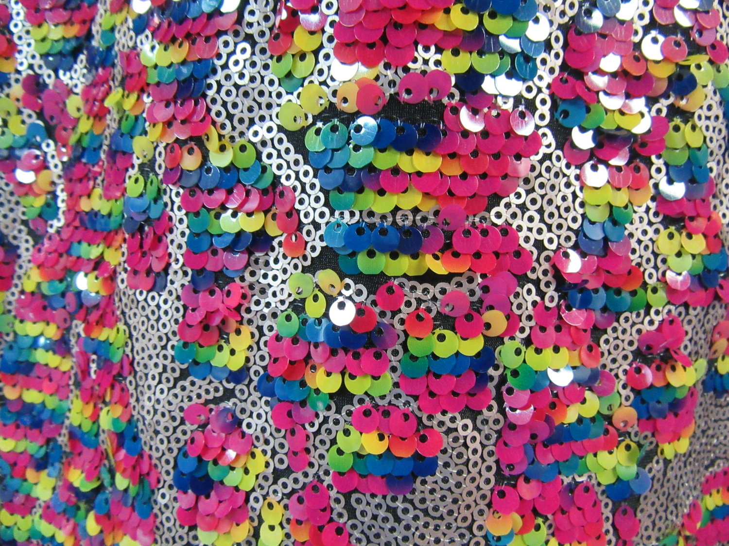 MULTI COLOR SEQUINE SEWN ON 90 % POLY 10 % BLACK SPANDEX . USAGE: COSTUME, DANCE, SPECIAL OCCASIONS.