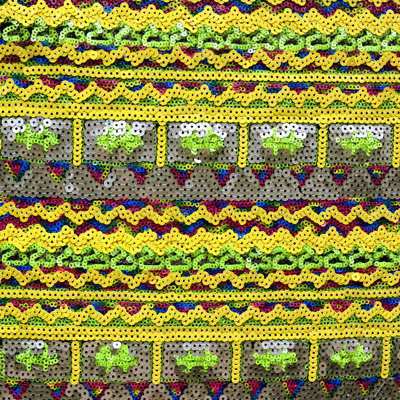 MULTICOLORED SEQUINS ON BLACK 100% POLYESTER NON STRETCH MESH.
