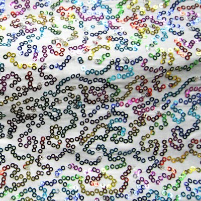 MULTICOLOR SEQUINS ON WHITE POLY. SPANDEX. USAGE: COSTUME, DANCE, SPECIAL OCCASIONS.