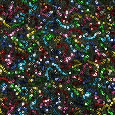 MULTICOLOR SEQUINS ON BLACK STRETCH MESH. USAGE: COSTUME, DANCE, SPECIAL OCCASIONS.