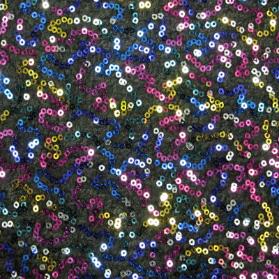 MULTICOLOR SEQUINS ON BLACK STRETCH MESH. USAGE: COSTUME, DANCE, SPECIAL OCCASIONS.