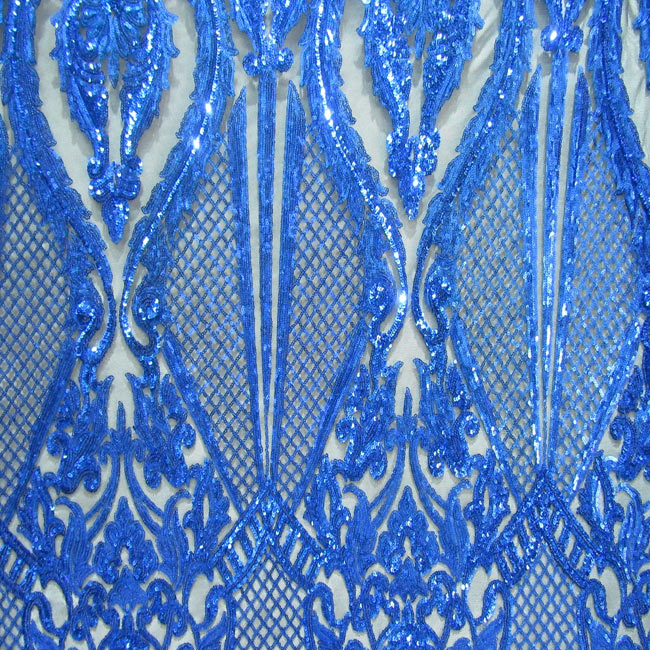 2 MM EMBROIDERY DESIGN ROYAL COLOR SEQUINE SEWN ON THE BLACK COLOR 90 % NYLON 10 % TWO WAY STRETCH MESH .