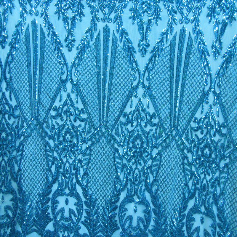 TREE DESIGN TURQUISE COLOR SEQUINE SEWN ON 90 % POLYESTER 10 % TURQUISE COLOR STRETCH MESH .