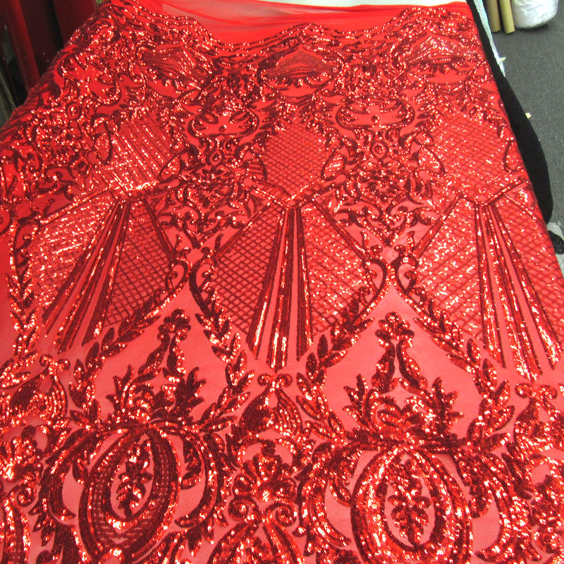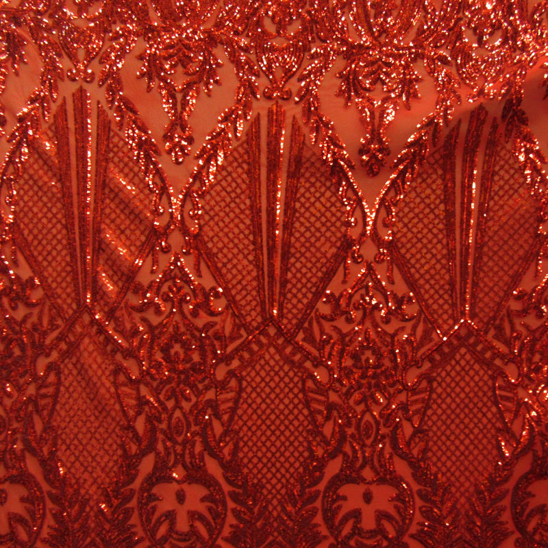 NET DESIGN RED COLOR SEQUINE SEWN ON 90 % POLYESTER 10 % RED COLOR STRETCH MESH .