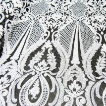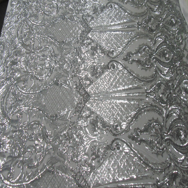 NET DESIGN SILVER COLOR SEQUINE SEWN ON 90 % POLYESTER 10 % WHITE COLOR STRETCH MESH .