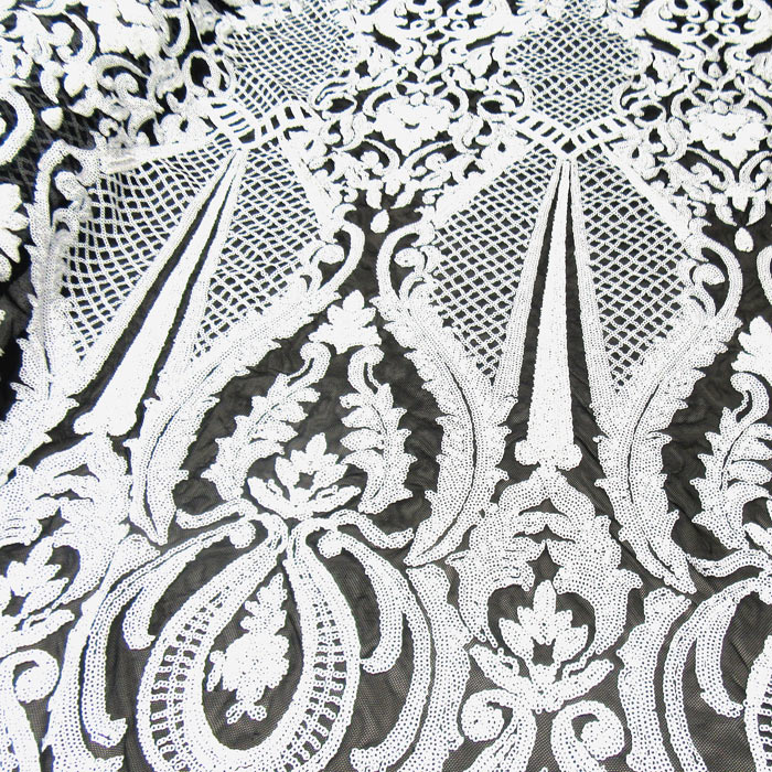 2MM WHITE COLOR SEQUINE WITH FANCY DESIGN SEWN ON 90% POLYESTER AND 10% BLACK COLOR STRETCH MESH