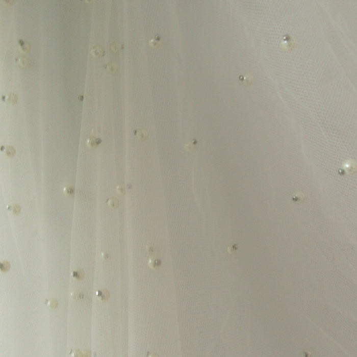 OFF/WHITE COLOR TULL NETTING WITH TWO SIZE PEARL 5" AND 6"SEWN ON 100% POLYESTER TULL MESH.