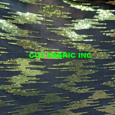 TWO WAY STRETCH OLIVE GREEN COLOR SEQUIN DESIGN ON 90 % POLY & 10 % SPANDEX .